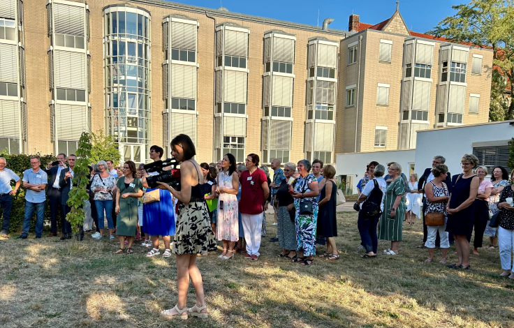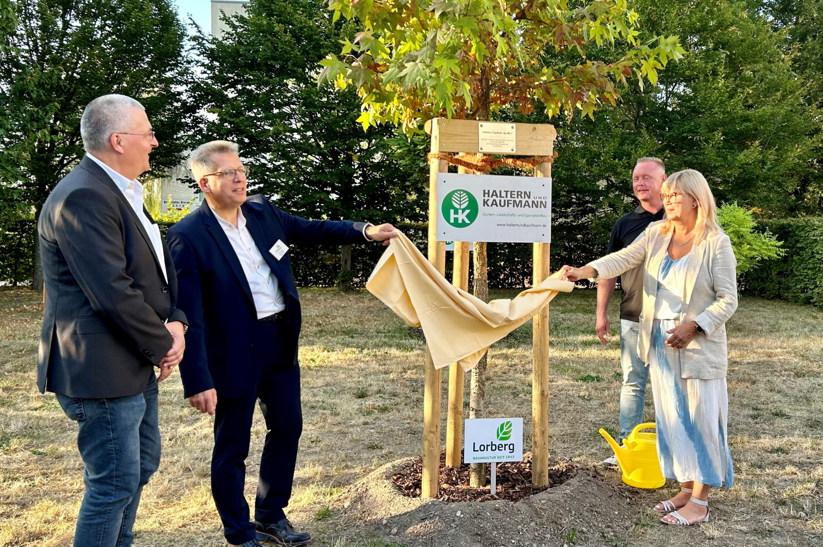 Teil des Festaktes bildete auch eine Baumpflanzung. Anlässlich des Jubiläums wurde ein Ahornbaum auf dem Gelände des Krankenhauses gepflanzt, der von der Fa. Haltern und Kaufmann gespendet worden ist. Oberbürgermeisterin Simone Borris übernahm das Angießen.